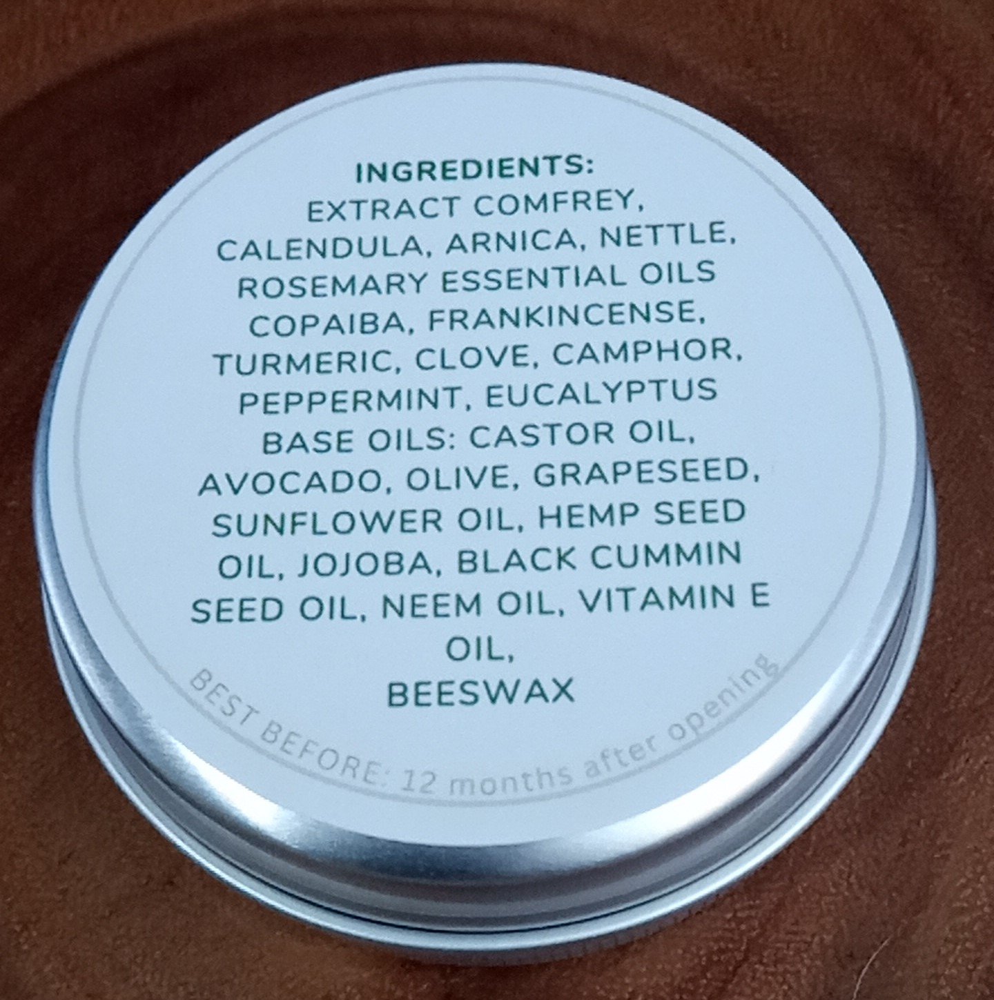 Ingredients: extract Comfrey, Calendula, Arnica, nettle, rosmary Essential Oils Copaiba, Frankincense, Turmeric, Clove, Camphor, Peppermint, Eucalyptus