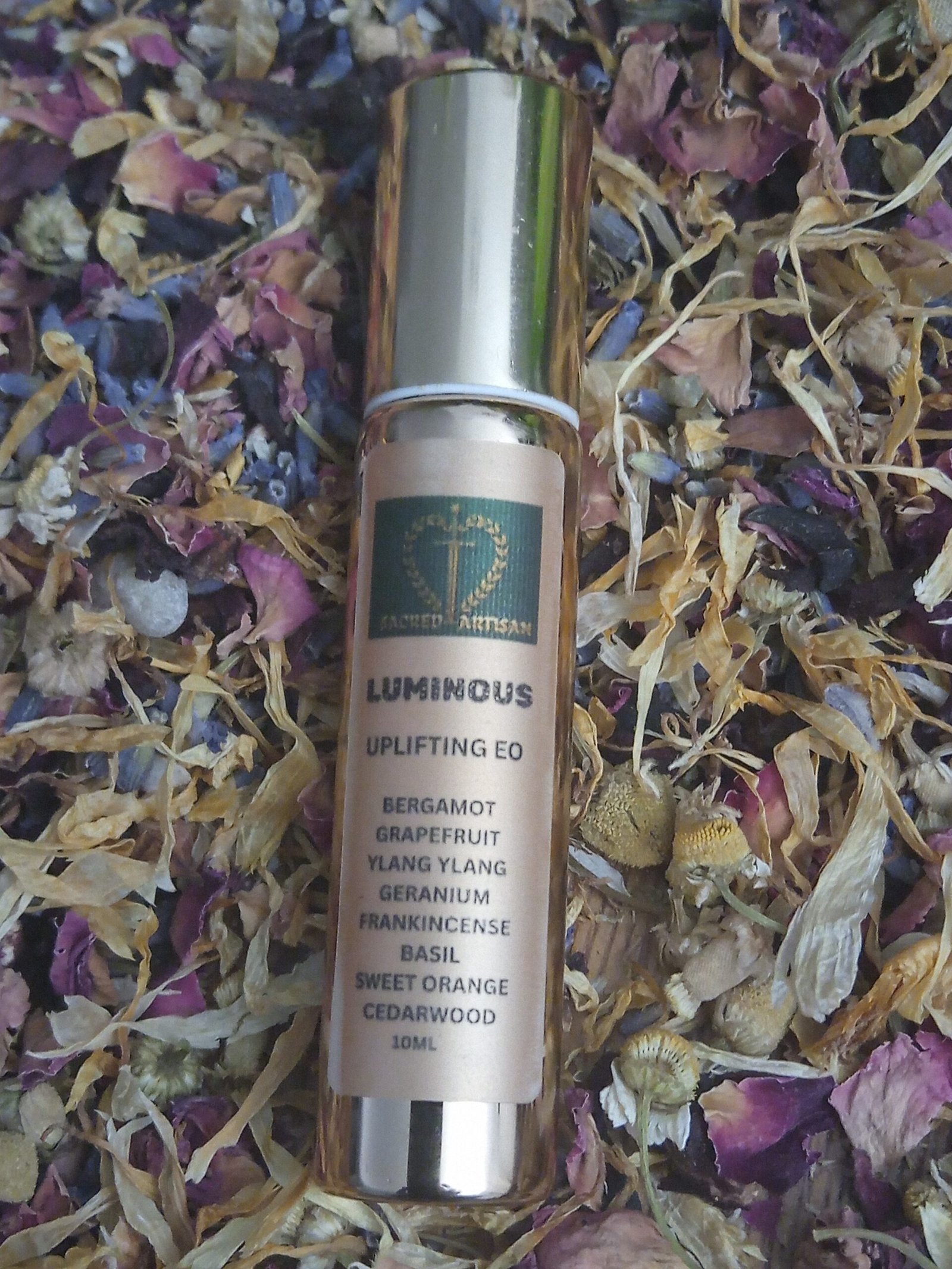 Discover the beauty of balance and rejuvenation with our carefully crafted uplifting essential oil blend. Designed to elevate your mood while keeping you grounded, this luminous formulation is ideal for moments when you need to rejoice, refresh, and reconnect with your inner peace. Encased in an opulent gold, glass roller bottle, this therapeutic fragrance combines luxury, convenience, and wellness in a single package.