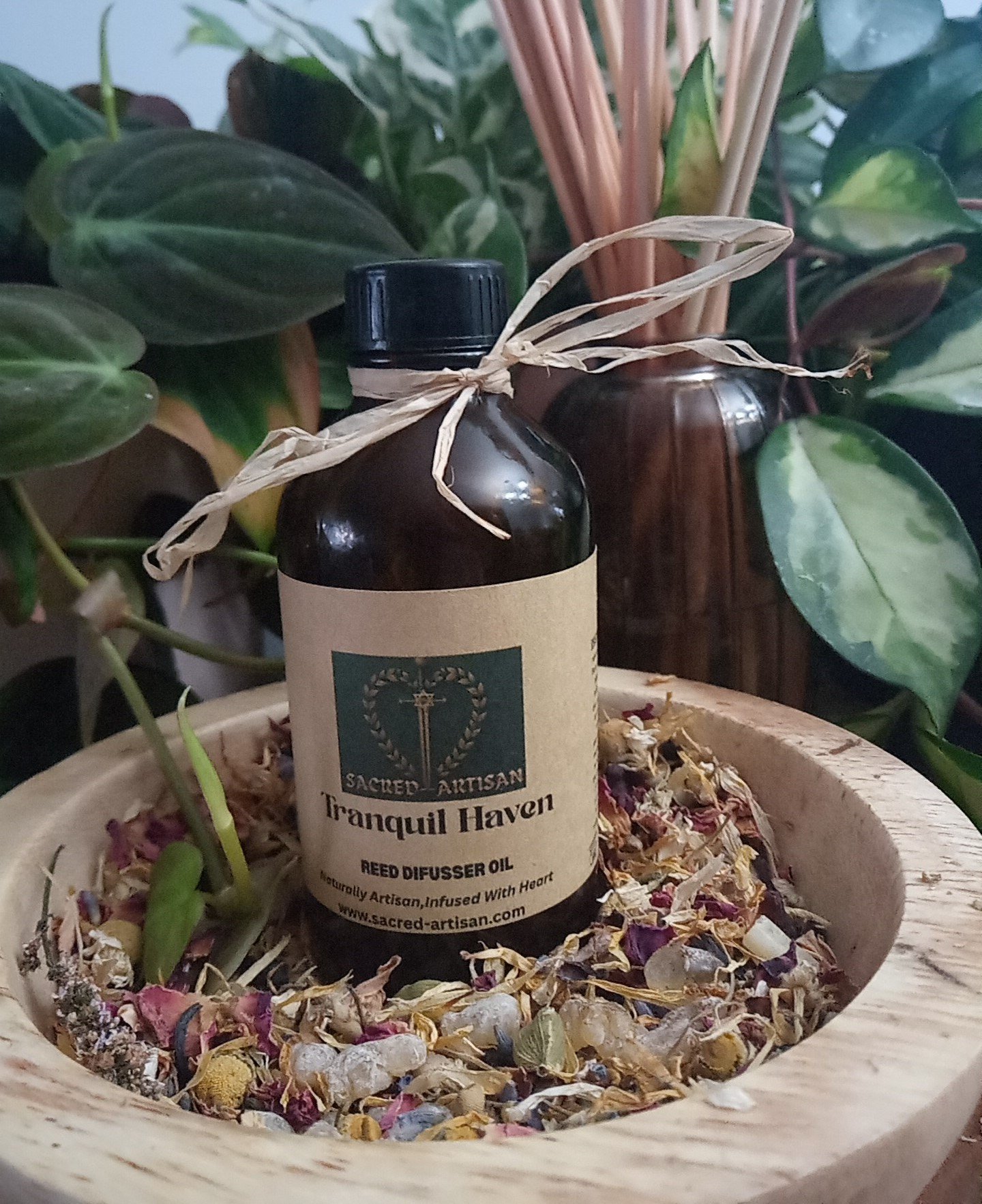 Elevate your living space with the Tranquil Haven Reed Diffuser Oil, a masterful artisan blend that harmonizes the soothing notes of bergamot, lavender, and clary sage with the rich undertones of myrrh, cedarwood, and tonka. Infused with a subtle hint of leather, this luxurious fragrance envelops your home in an opulent, long-lasting aroma that transforms any room into a serene sanctuary.